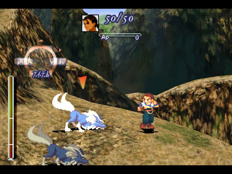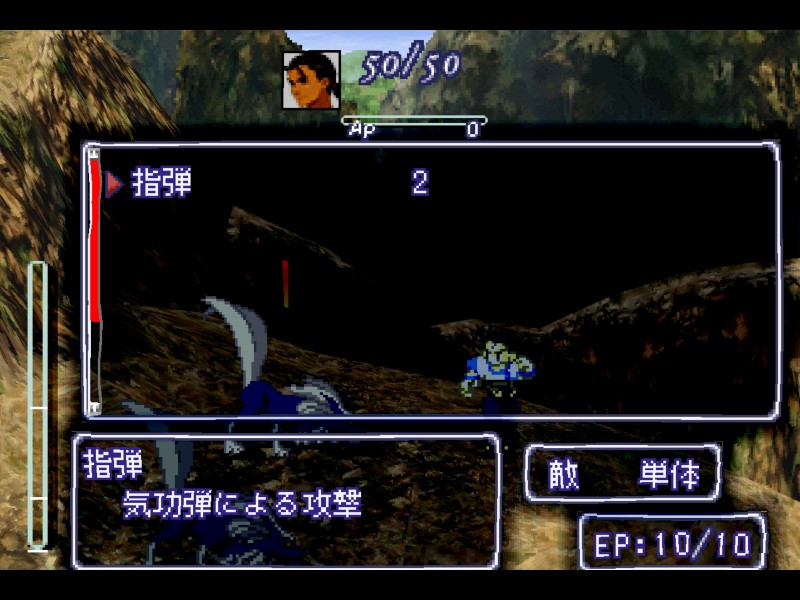 처음 전투에 들어가면 화면 왼쪽 위에 공격(攻擊 - Attack), 기공(氣攻 - Chi), 방어(防御 - Defense), 아이템(アイテム - Item) 등의 메뉴가 원형으로 배열되어 있습니다. 원형 메뉴의 위쪽 부분은 인물별로 각기 다른 특수능력이 표시됩니다. 현재 사진속 인물의 특수능력은 '기공'이라는 이름임을 알 수 있습니다. 이제 원형 메뉴가 뜬 상태에서 방향키를 상하좌우로 한두번 더 움직이면 새로운 원형 메뉴가 뜹니다.