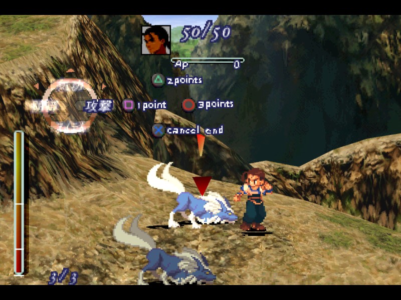 공격 명령을 선택하면 일반적인 통상 공격을 할 수 있습니다. 공격 대상을 정할 수 있는데, 잘 보면 버튼 마다 포인트가 다릅니다. 구체적으로 보면 □(약 공격, 1점), △(중 공격, 2점), O(강 공격, 3점), X(취소/끝) 이라고 적혀 있습니다. 화면 아래를 보면 사용가능한 기본 포인트가 주어지는데 처음에는 3/3이라고 표시되어 있습니다. 따라서 현재로서는 □□□, □△, △□, O 등의 공격을 펼치면 3포인트를 모두 소비하게 됩니다.