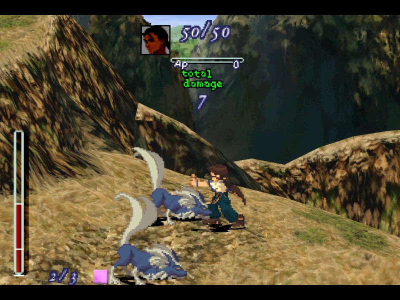 어느 공격을 펼쳤는지는 화면 아래에 표시가 되며 몇 포인트가 남았는지도 알 수 있습니다. 만일 포인트를 모두 사용하지 않고 중간에 취소(X 버튼)하면 남은 포인트가 저장되며 턴이 끝나고 그 수치가 상단에 AP(Action Point)로 표시됩니다. 주의할 점으로 방어만 하면 절대로 AP가 저장되지 않고, 약 공격(1점)이라도 한 번은 해야 남은 AP를 저장할 수 있습니다. 최대 저장 가능한 AP는 28점까지입니다. 처음에는 기본 포인트가 3점에 불과하지만 게임진행에 걸쳐 조금씩 증가하다가 최종적으로는 기본 포인트가 7점까지 올라갑니다.