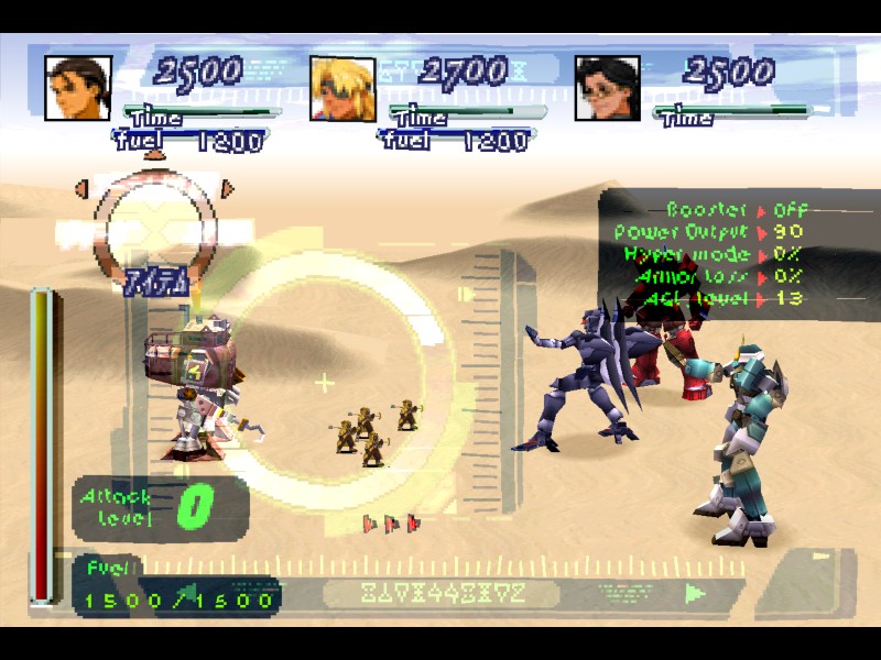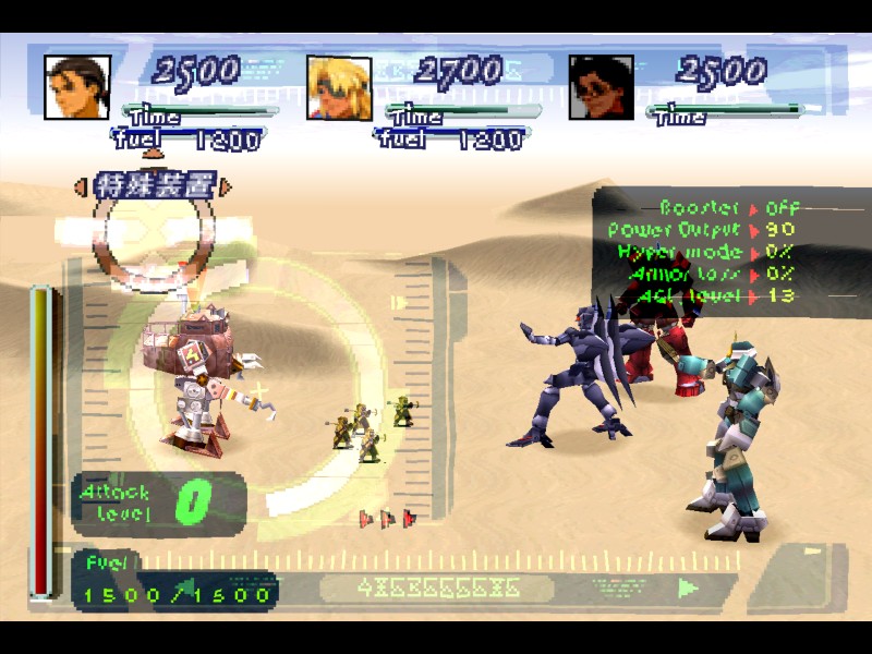 기본 명령 상태에서 방향키를 상하좌우로 한두번 더 움직여 보면 새로운 명령들로 바뀝니다. 특수장치(特殊装置 - Special Options), 부스터(ブースター - Booster), 도주(逃走 - Escape), 아이템(アイテム - Item) 등의 명령으로 바뀌는 것을 알 수 있습니다. 전투화면을 보면 가장 위에는 기어별로 HP가 있고, 가장 아래에는 해당 기어의 연료량(Fuel)이 보입니다. 그리고, 어택 레벨(Attack Level)이 0이라고 나와 있는 것에 주목하세요.