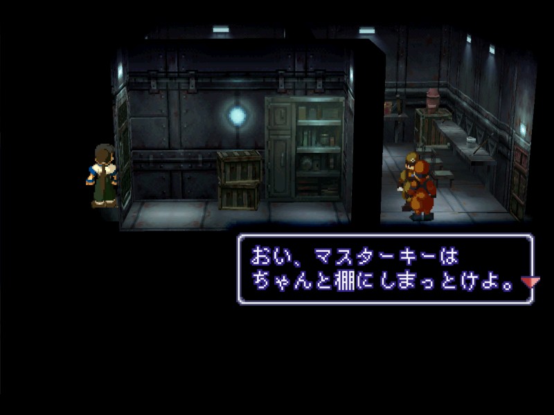 병사들이 나가면 빙 돌아서 선반으로 가서 마스터키(Master Key)를 얻을 수 있습니다. 덤으로 '프레임HP30(Frame HP30)'이라는 기어용 액세서리를 얻습니다. 이것을 기어에 액세서리로 장착하고 전투중 특수장치 커맨드를 사용하면 기어의 HP를 회복시킬 수 있는 좋은 아이템입니다. 다만 꽤 많은 연료가 소비되기 때문에 차라리 다른 강화 아이템을 장착하고 속전속결로 싸우는 것이 좋을 수도 있습니다.