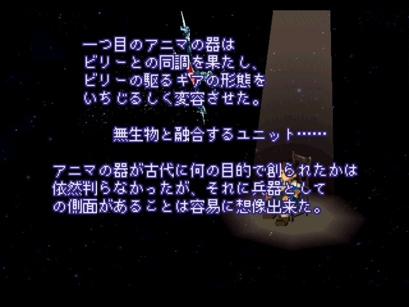 아니마 던전 1에서 찾은 아니마의 그릇은 빌리와 동조해서 빌리의 기어 형태를 두드러지게 바꾸었습니다. 고대문명의 산물인 아니마의 그릇은 무생물과 융합하는 유닛으로서 정확히는 잘 모르지만 그당시 병기로서 사용된 것은 분명히 알 수 있습니다.