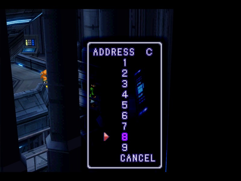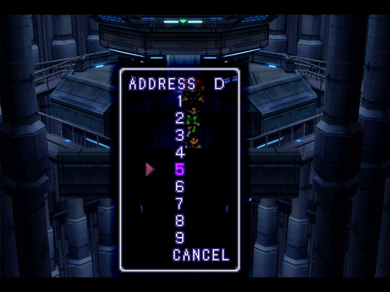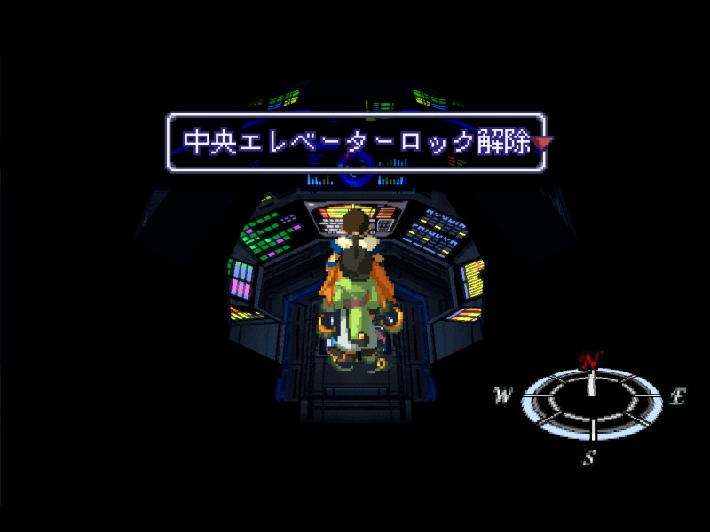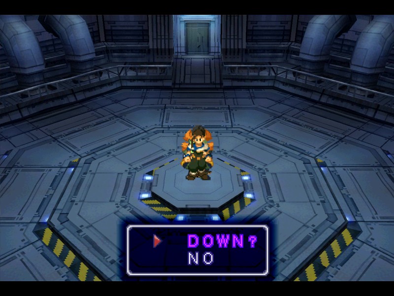 이어서 중앙 승강기에 탑승하라는 메시지가 나오니, 중앙 승강기에 타면 UP, DOWN을 묻는데 진행하려면 DOWN을 선택합니다.(필요하면 UP을 선택해서 올라가 메모리 큐브에 게임을 저장하고 다시 내려가도 됩니다.)