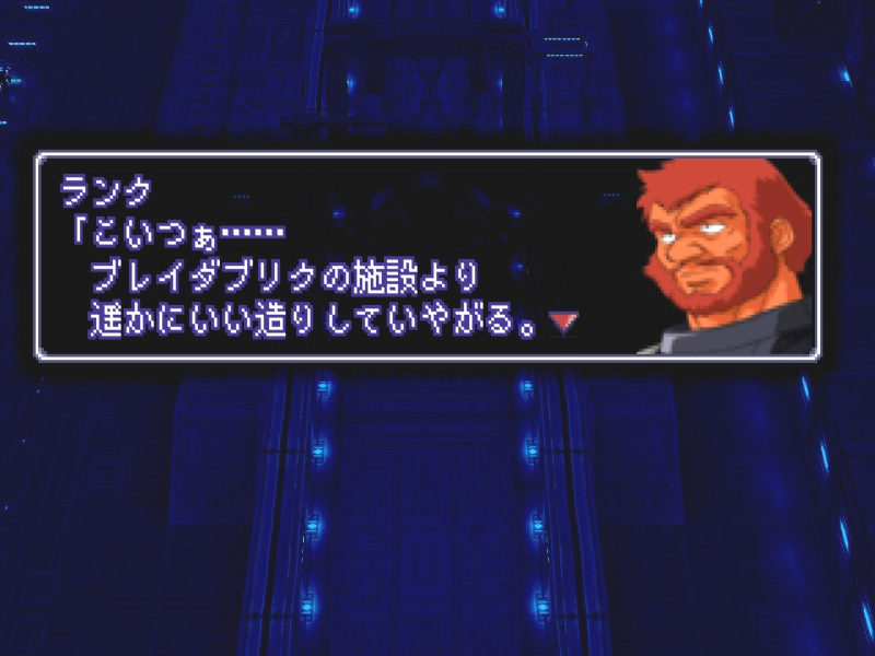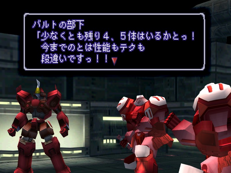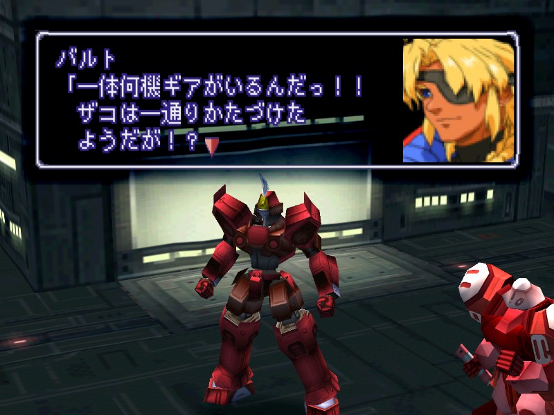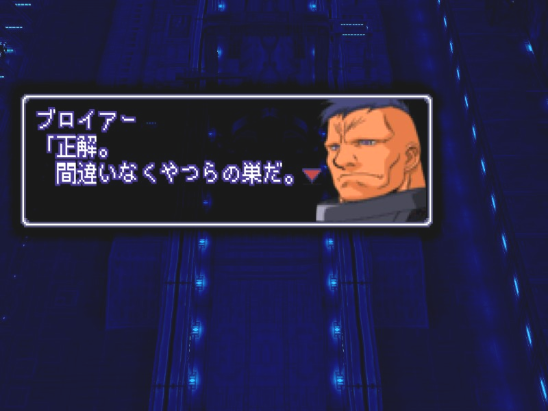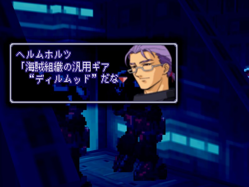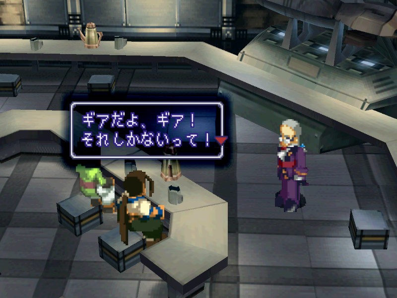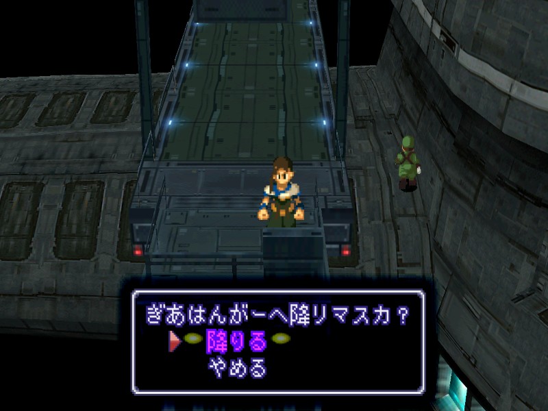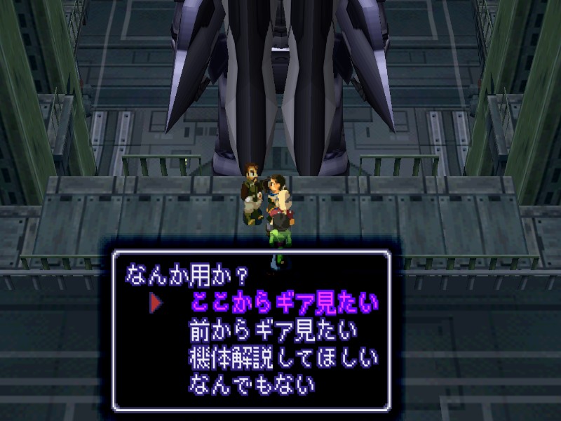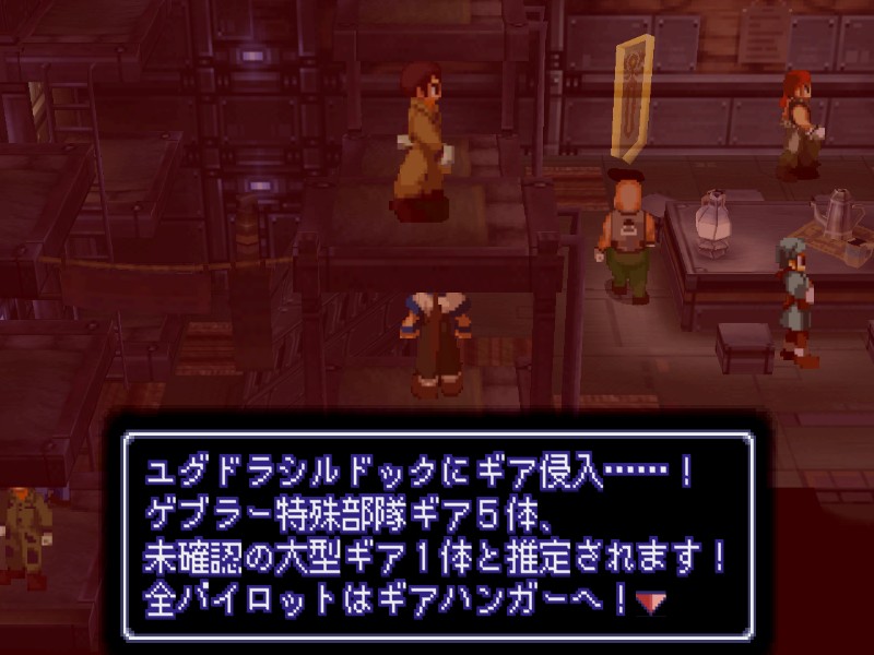 해적 아지트는 비상이 걸려서 다들 우왕좌왕하고 있는데, 방송에서 게브라 특수부대의 기어 5기와 미확인 대형기어 1기가 다가오니 다들 격납고로 오라고 합니다. 페이를 움직여 방을 나와 바로 남쪽 근처의 승강기를 타고 내려갑니다.