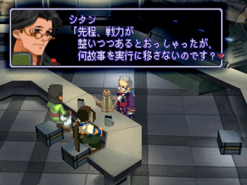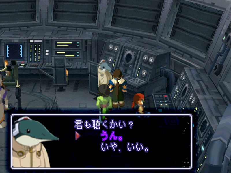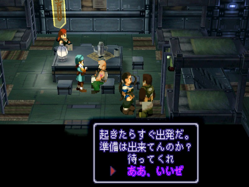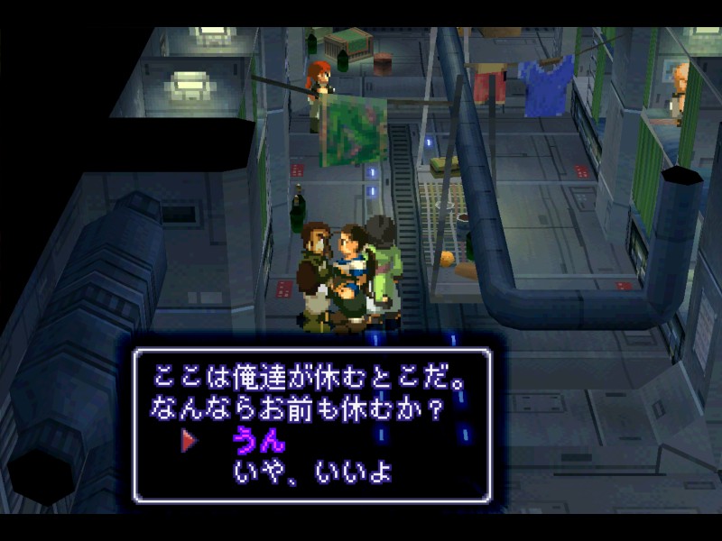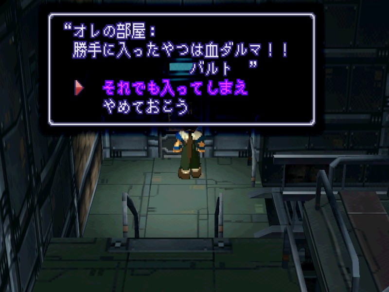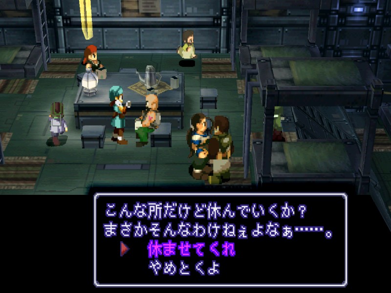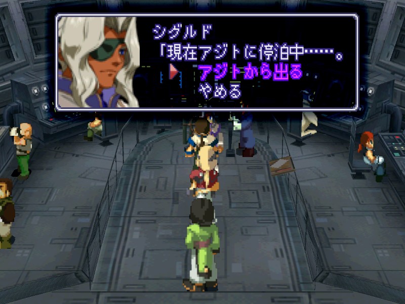 페이를 움직여서 다시 잠사함 유그드라실의 해치 바로 옆의 승강기를 타고 올라갑니다. 올라가서 북쪽에 있는 문을 열고 들어가면 아까도 봤던 침실이 있습니다. 아직 더 할 일이 있으면 좀더 돌아다녀도 좋고, 스토리 진행을 위해서는 문 바로 옆에 있는 남자에게 말을 걸어 휴식을 취하면 됩니다(두번째 선택지).
