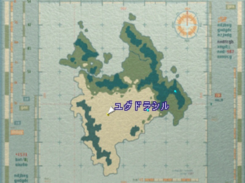 함교에 있는 승무원 중에 이 사람과 대화하면 항해지도를 볼 수 있고 현재 잠사함 유그드라실의 위치가 노란색 점으로 표시됩니다. 파란색 점은 마을의 위치입니다. 일단 현재 대륙의 모습을 잘 봐두세요.