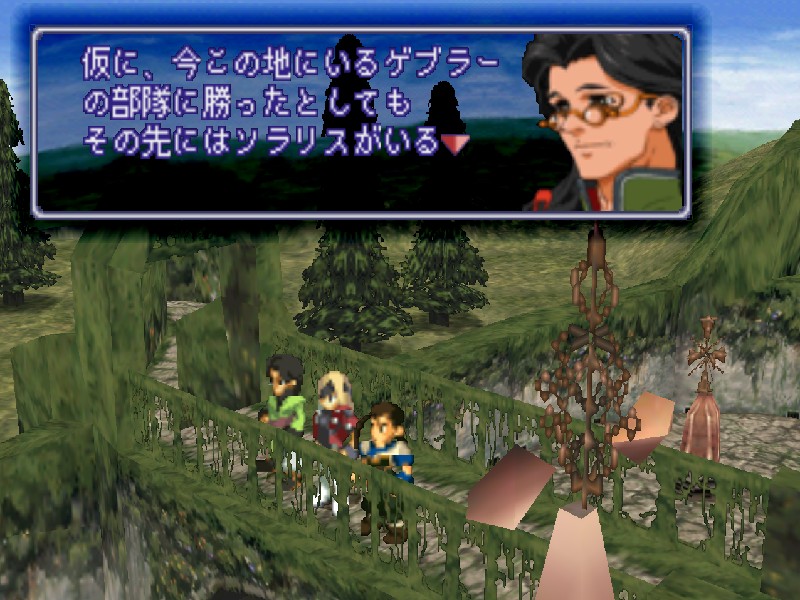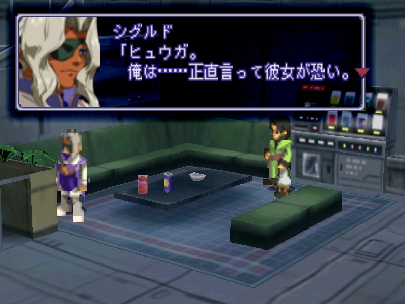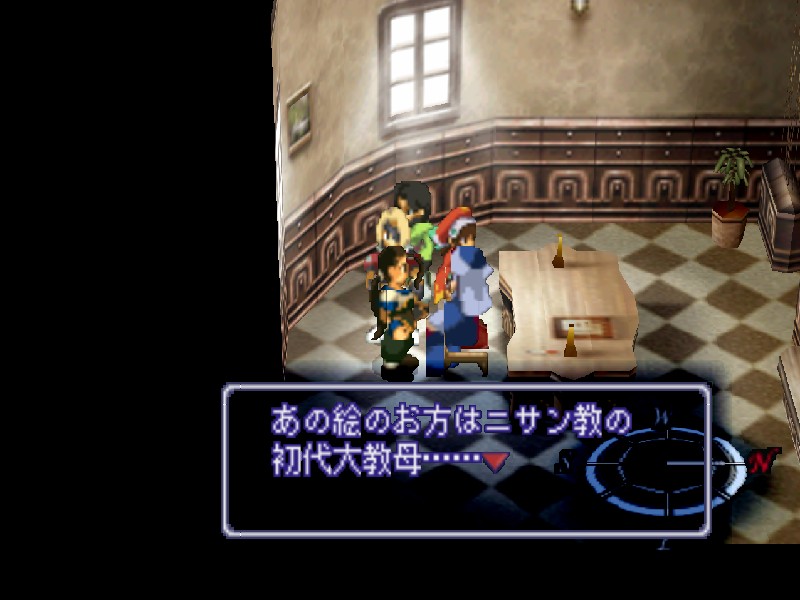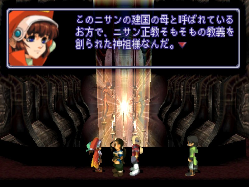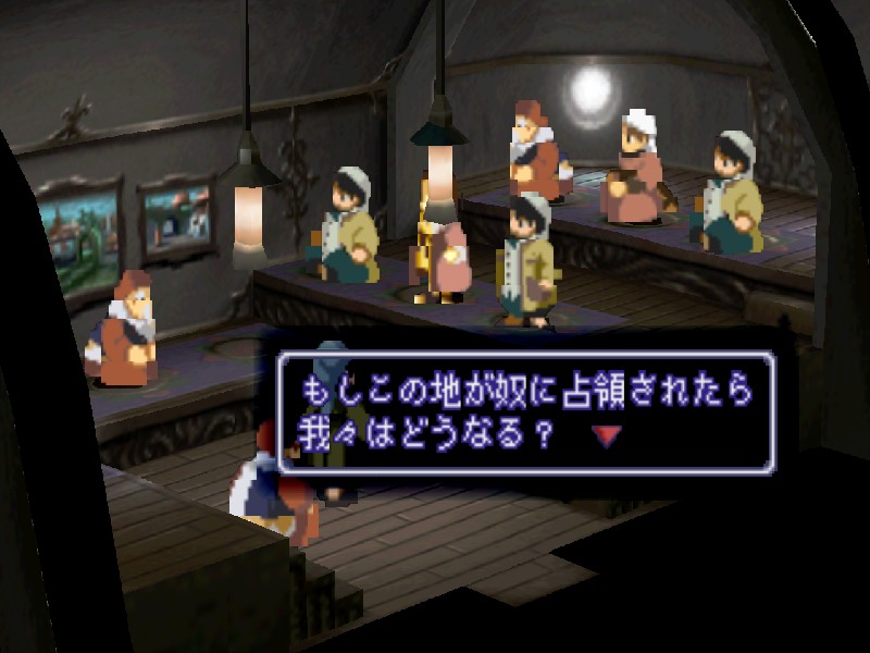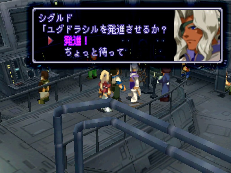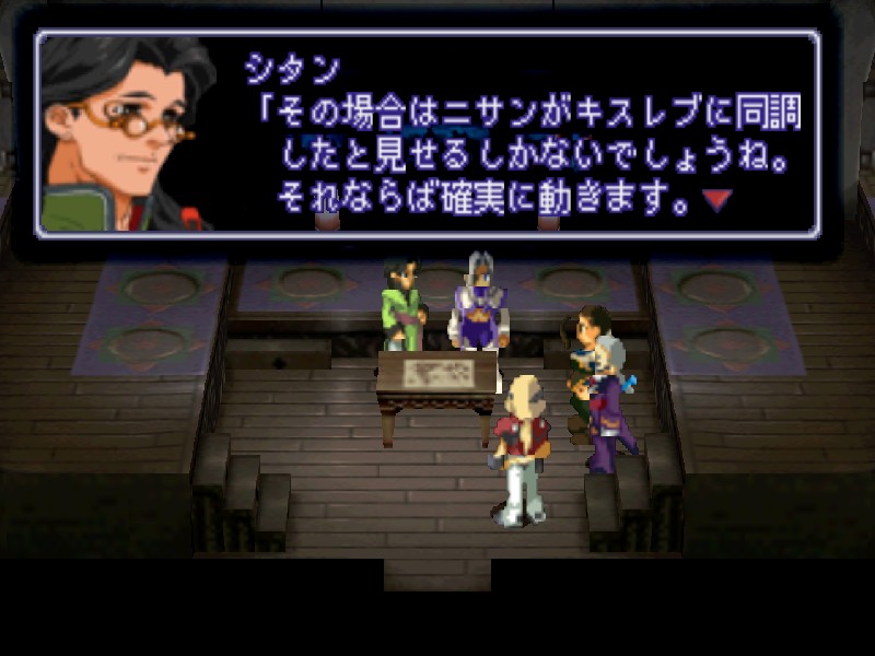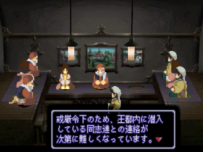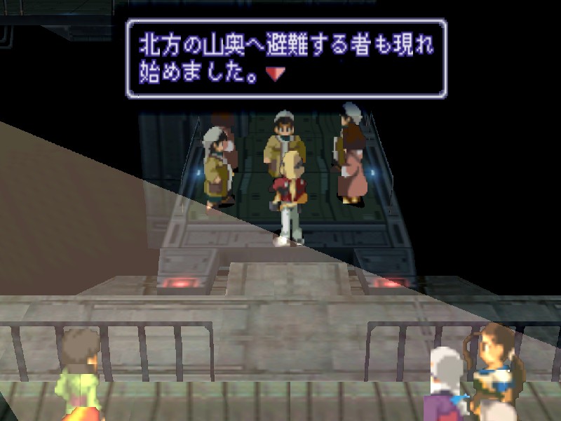 니산 지하의 비밀 부두에 잠사함 유그드라실을 정박시키자 관계자들이 환영하러 나옵니다. 하지만 니산 법황부의 상황도 그리 좋지는 않습니다. 아베의 진격이 염려되어 법황부의 대표들이 의사당에서 회의중이며, 바트와 마르의 휘하에 사람들이 몰려들어 분위기가 흉흉합니다. 어쨌든 대교모인 마르의 귀환에 일단 모두들 기뻐하고 있습니다.